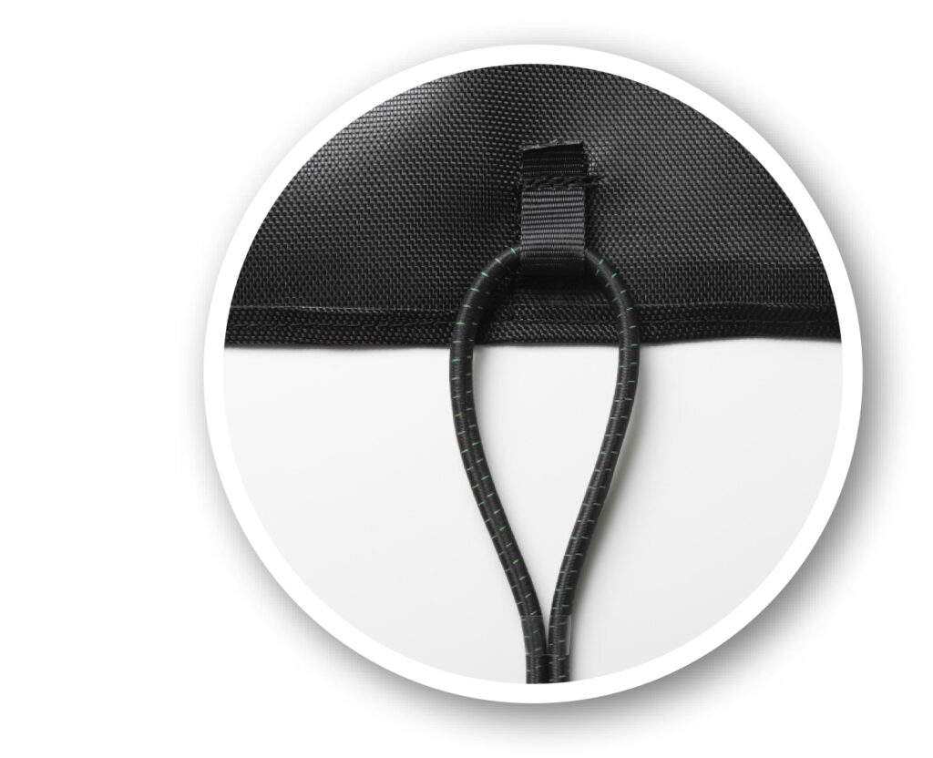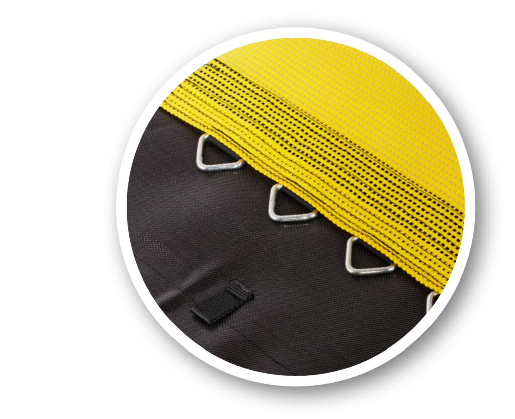 Für maximalen Schutz. Die Verlängerung des Sprungtuchs verläuft zwischen den Federn und den Schutzpolstern. Sie minimiert das Risiko, dass ein Springer in direkten Kontakt zu den Stahlfedern geraten kann und reduziert gleichzeitig den Verschleiß der Polster auf der Unterseite auf ein Minimum.